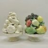 Estas piezas poseen un acabado brillante, una base con un diseño de pedestal blanco y en su parte superior una variedad de frutas y verduras con hojas entre ellas. Una de las piezas se encuentra pintada a mano con la técnica de mayólica, lo que le da una acabado de colores nítidos.