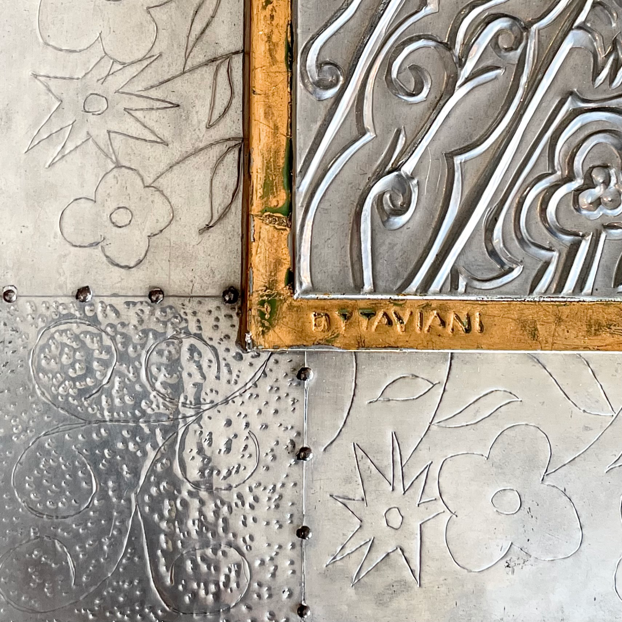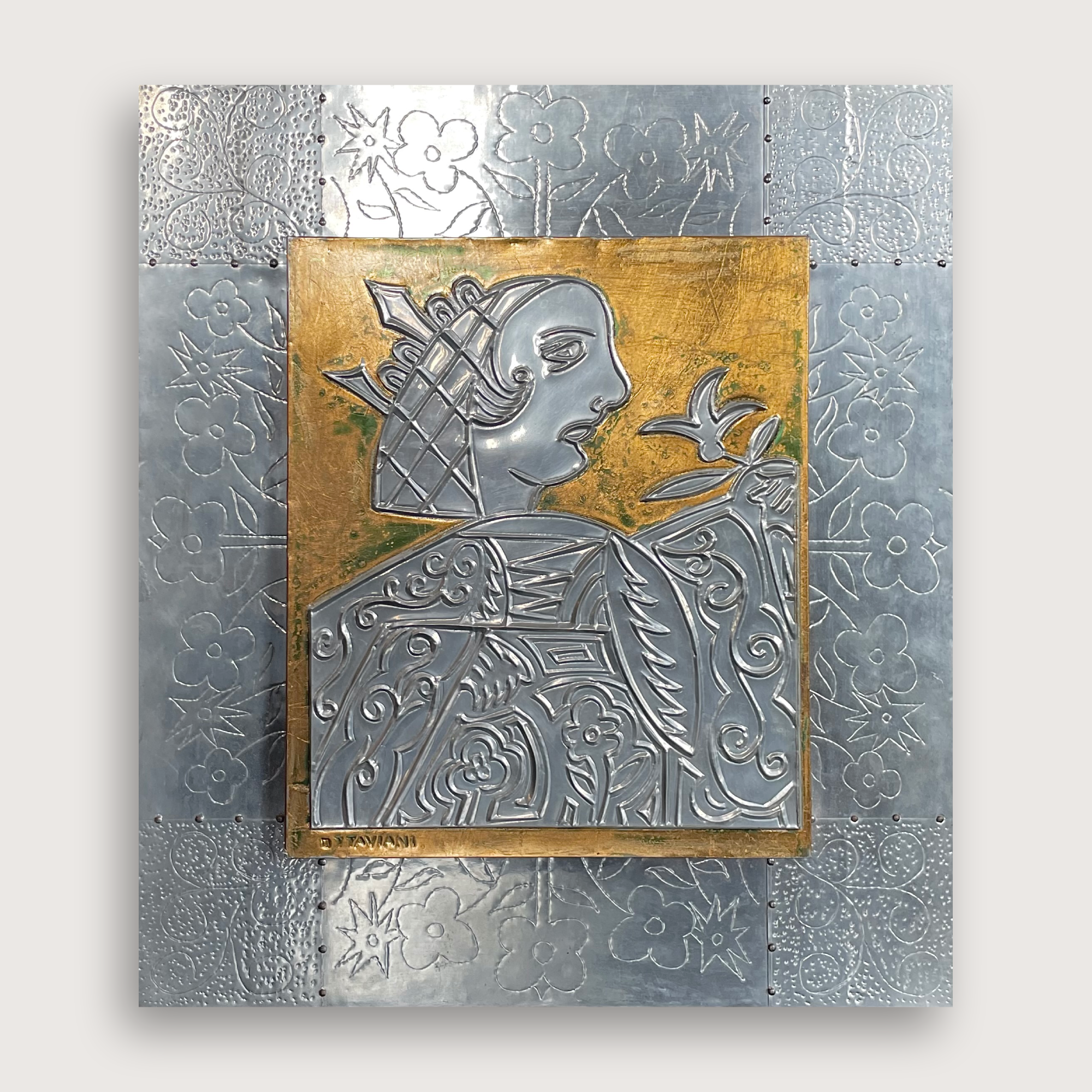 La técnica empleada en esta pieza es el sbalzo e cesello (repujado y cincelado), un proceso tradicional que consiste en martillar el reverso de una lámina metálica para crear relieves (sbalzo), y luego definir los detalles desde el frente con cinceles finos (cesello). Esta práctica minuciosa, completamente manual, refleja una herencia artesanal profundamente italiana, reinterpretada en clave moderna a través del lenguaje escultórico de Ottaviani.