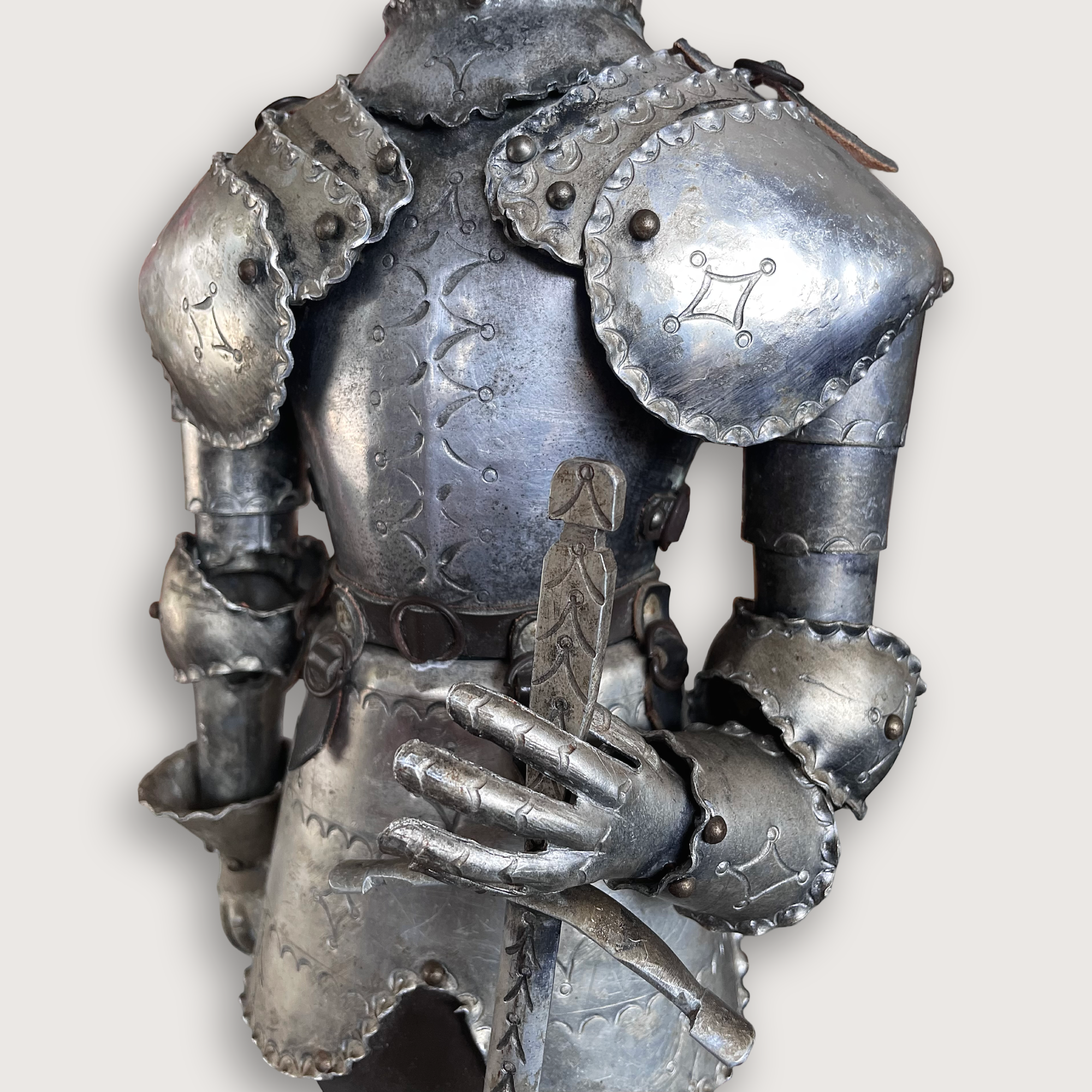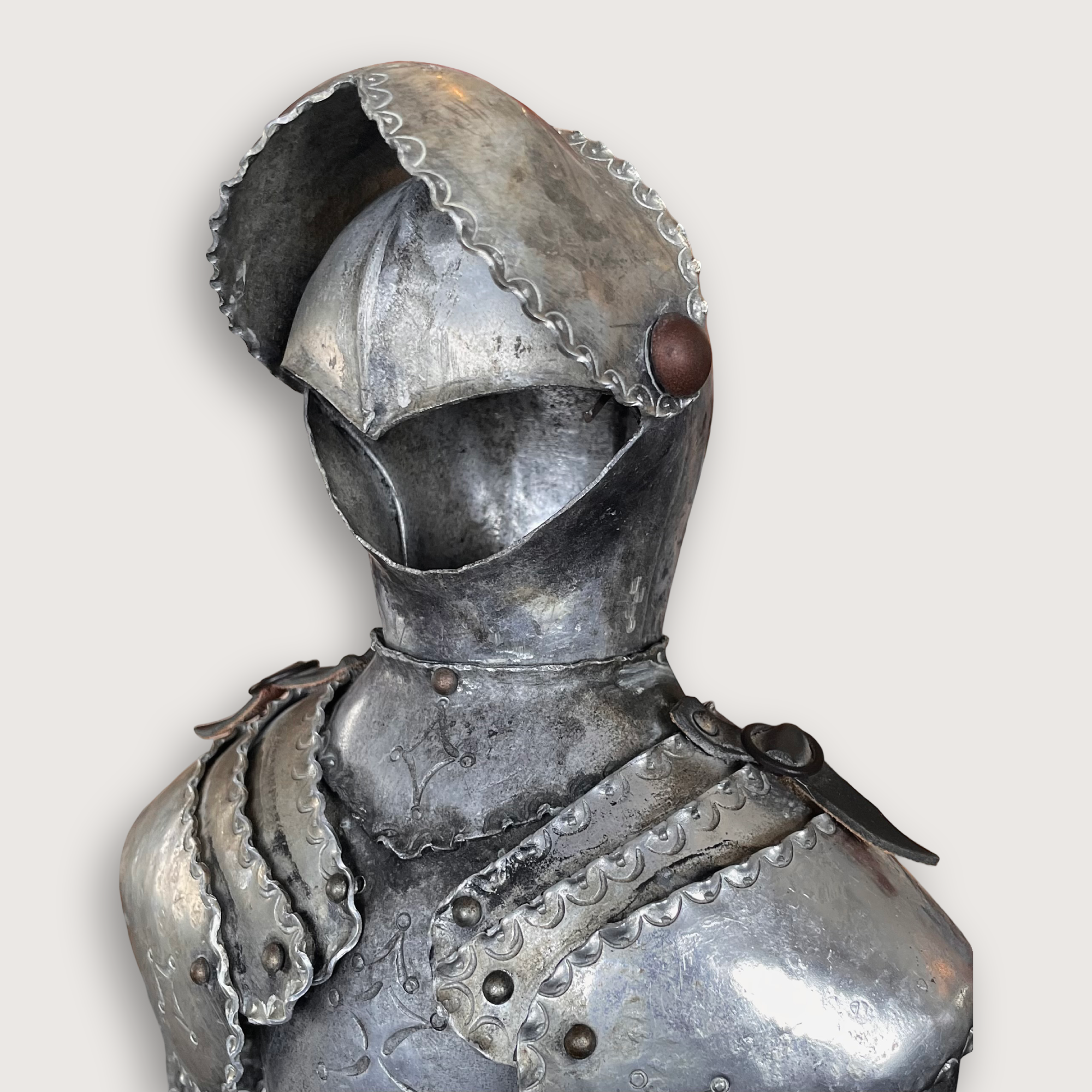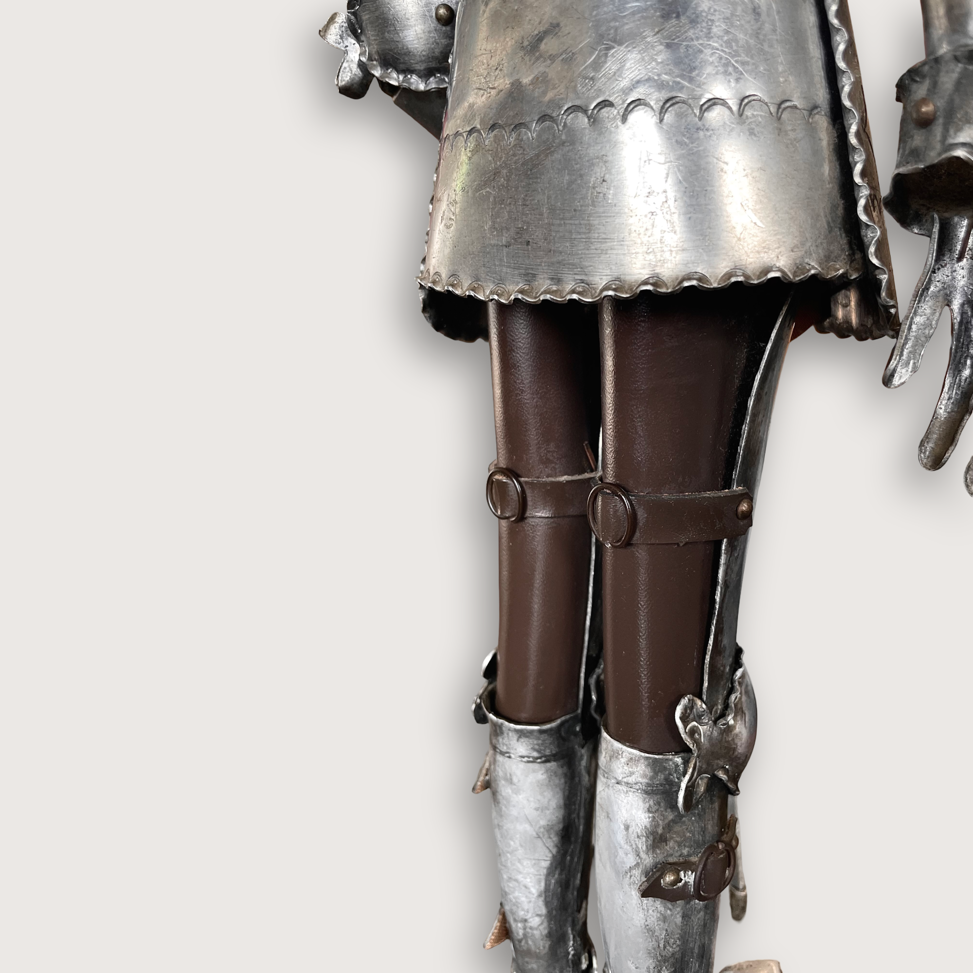 Inspirada en estas armaduras renacentistas, esta reproducción decorativa en acero bruñido conserva el realismo de las piezas históricas, con su interior hueco, proporciones exactas y detalles en cuero que aportan calidez y autenticidad.