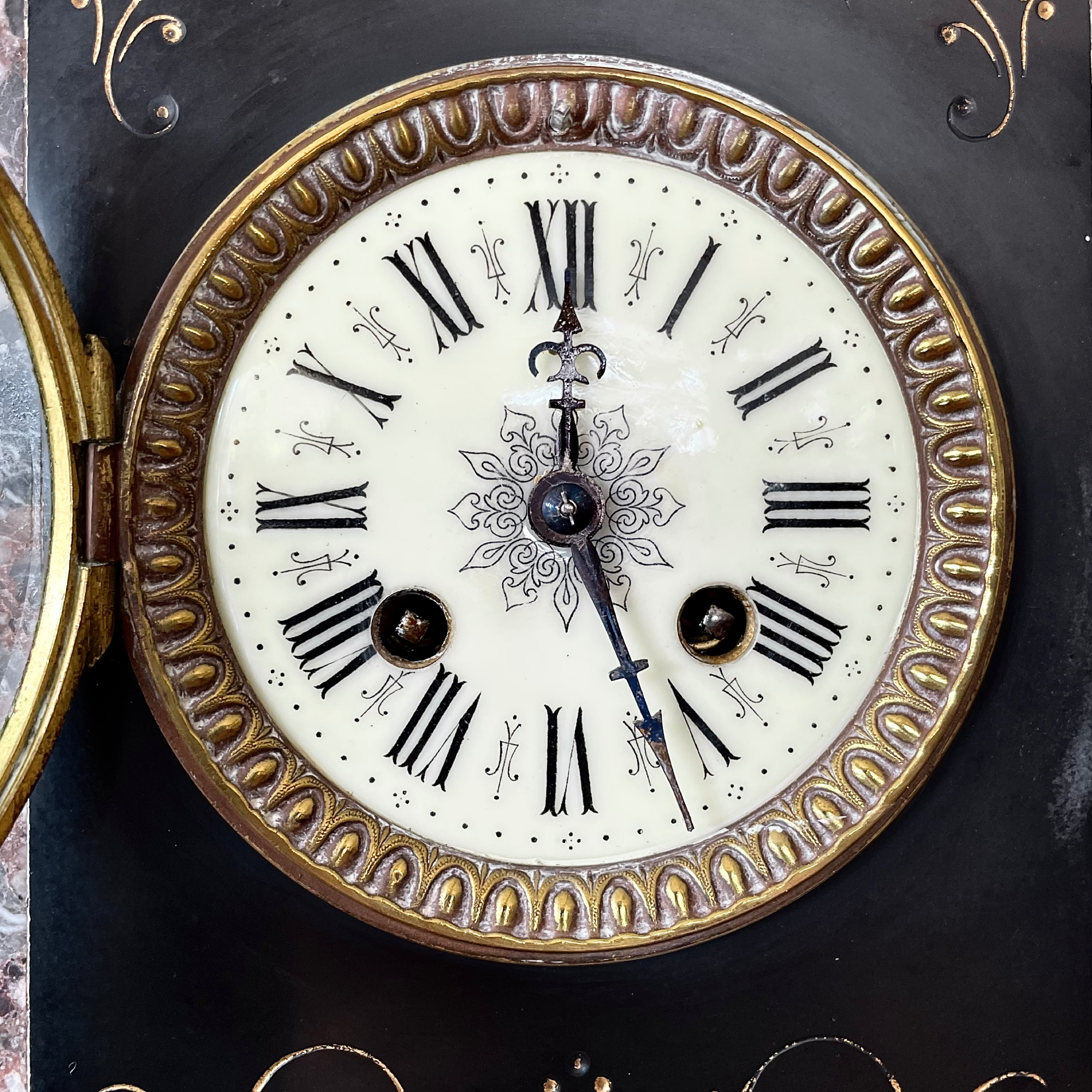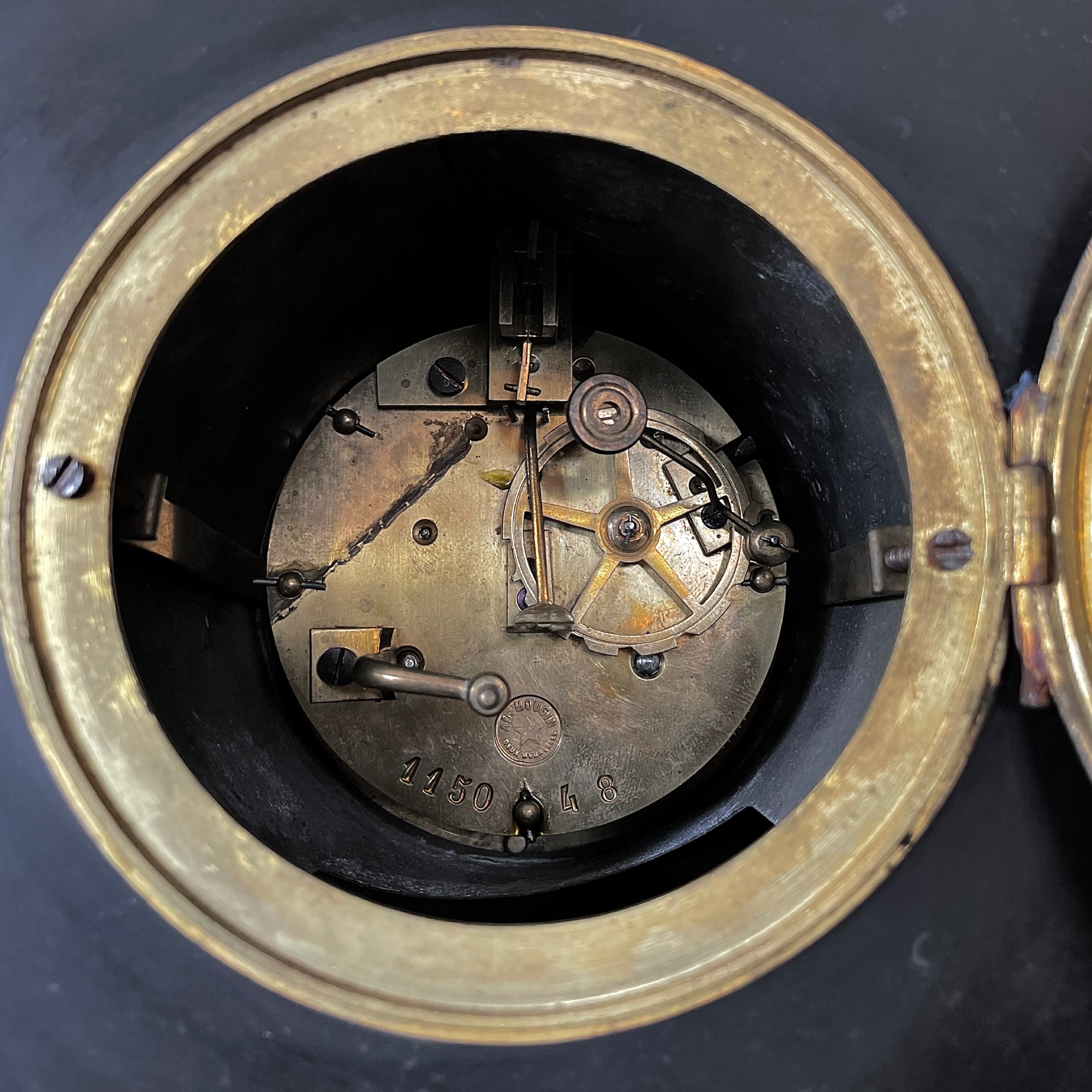 Este reloj de mármol negro con aplicaciones de bronce dorado es un ejemplo representativo de ese periodo. Sus formas ornamentales, patas en forma de garra y coronamiento elaborado aluden al gusto por lo escénico y lo majestuoso. Estas piezas no solo marcaban el tiempo, sino también la posición social de sus dueños, siendo comunes en residencias burguesas y palaciegas de la Francia del siglo XIX.