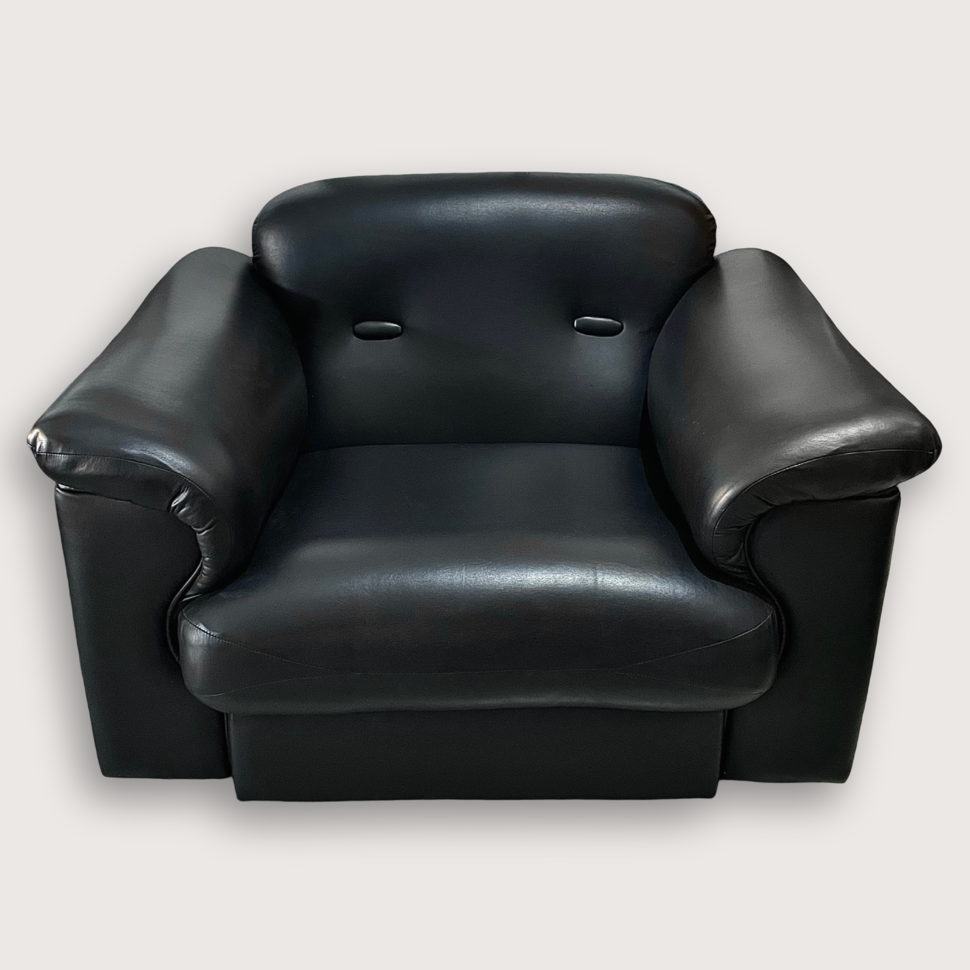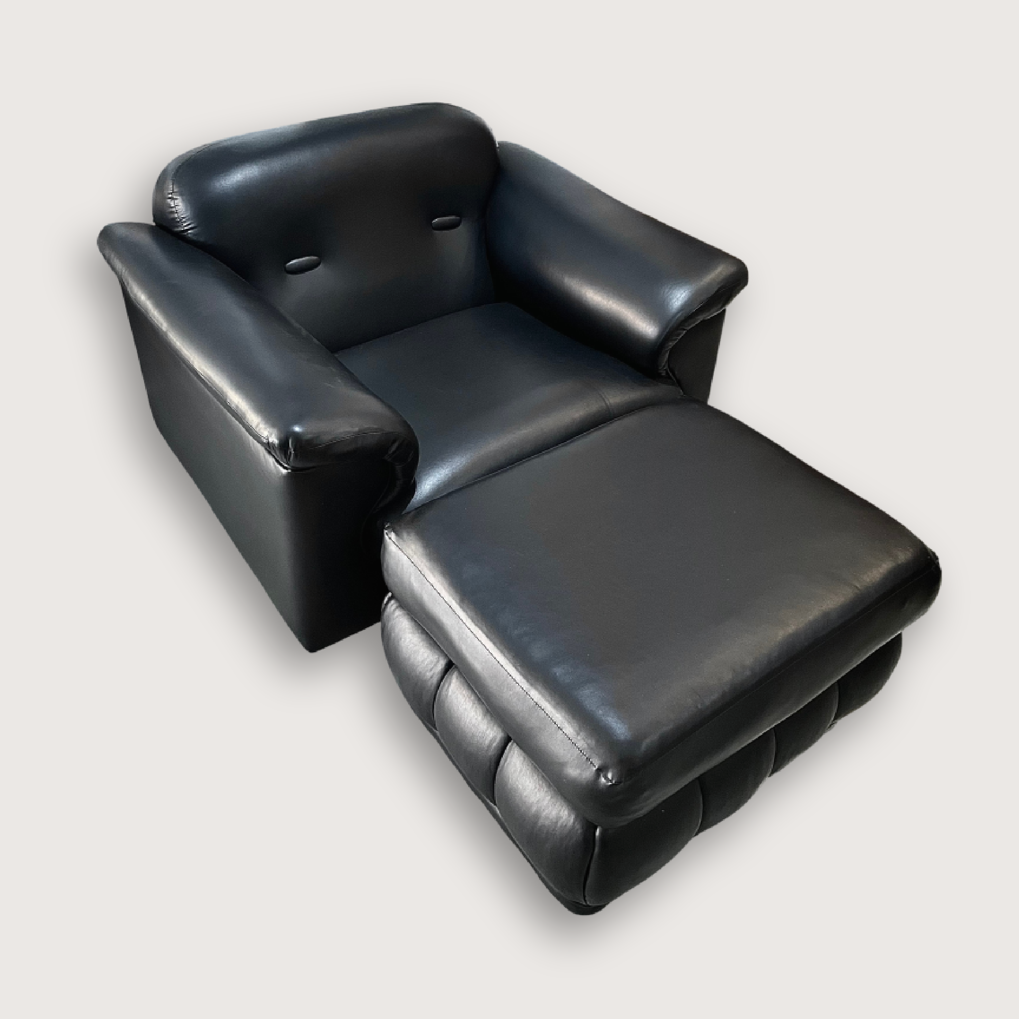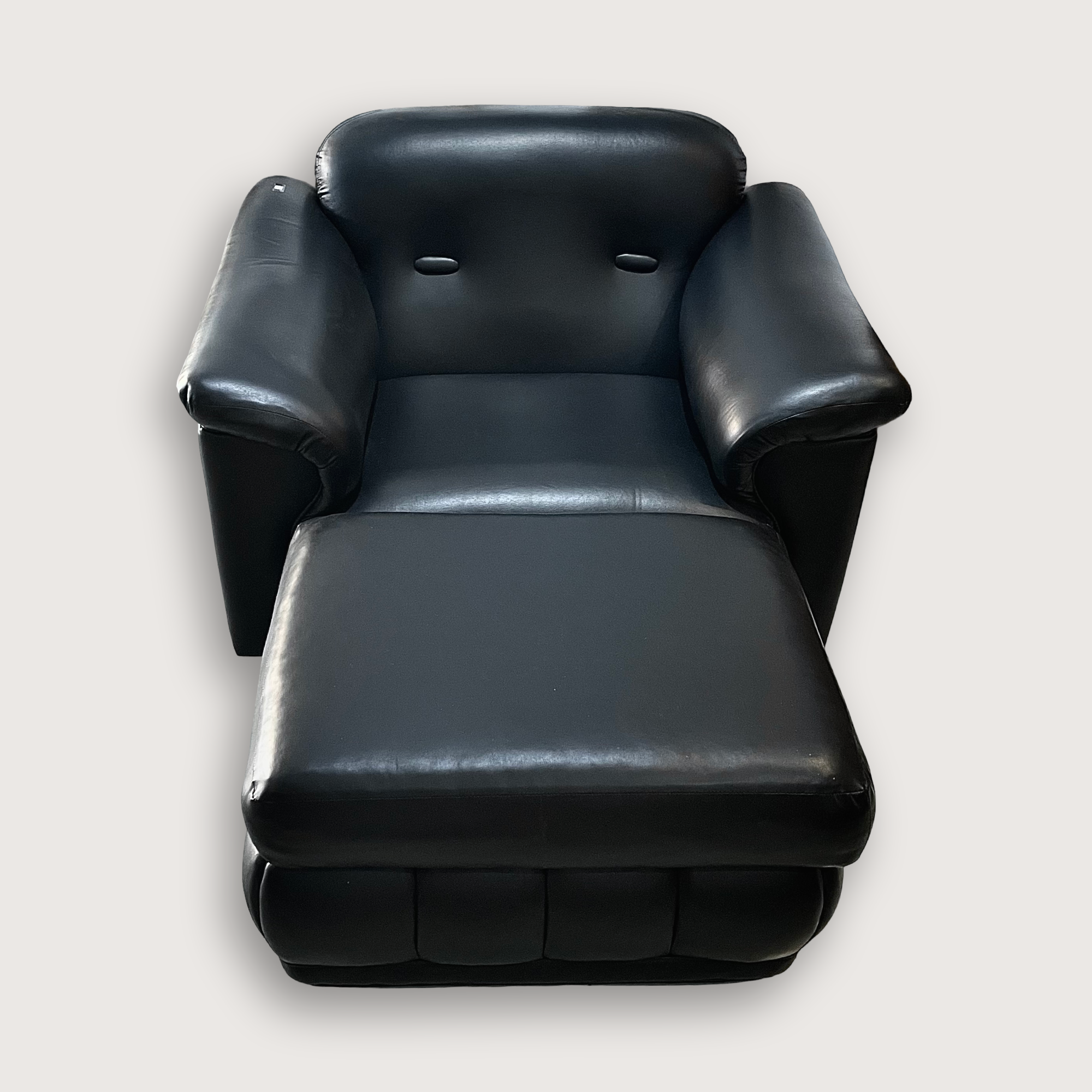 Este sillón con otomán encarna perfectamente ese espíritu: tapizado en vinil negro, con brazos acolchados que esconden estructura de madera y un mecanismo manual que permite inclinar ligeramente el respaldo. Una pieza sólida y funcional que conserva el encanto vintage propio de su época.